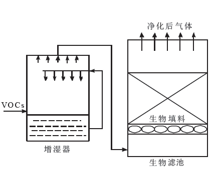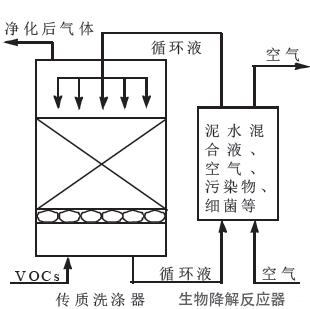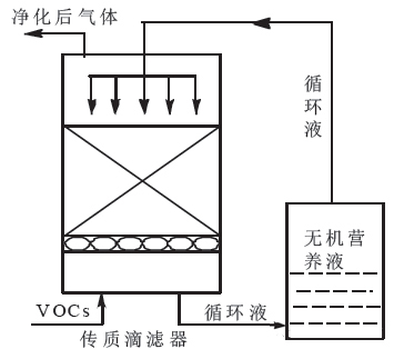 生物洗滌器(下圖)反應條件溫和、操作穩(wěn)定;但其運行成本高,處理的VOCs 需要易溶于水。